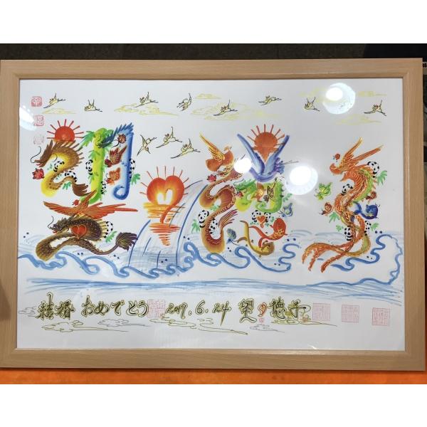 A4額付き4文字迄、お客様の名前を書きます 開運風水 花文字 横浜中華街 送料無料 金婚式 銀婚式 米寿 古希 喜寿 還暦 退職 入園