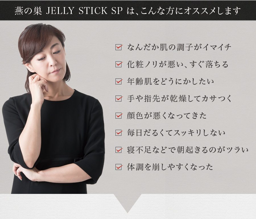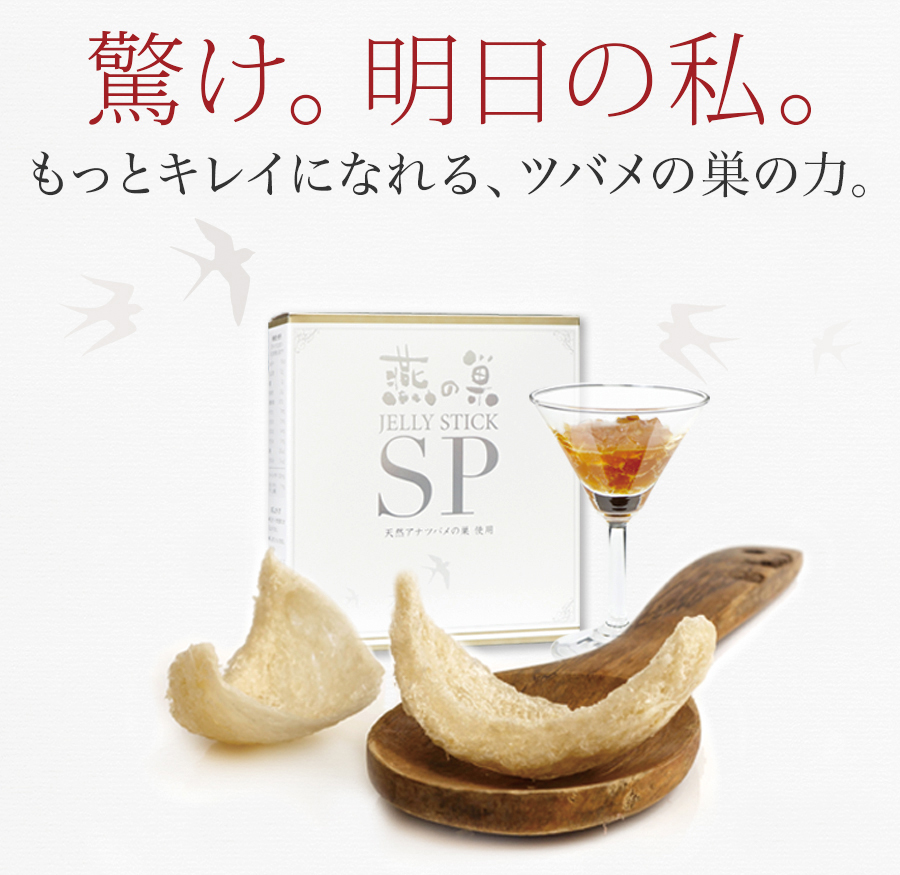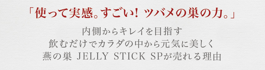 燕の巣 JELLY STICK SPは、美容と健康をサポートする「天然E.G.F.作用物質」「天然F.G.F.作用物質」「シアル酸」などを豊富に含む【美津村燕窩エキス】はもちろん、コラーゲンペプチドなどの美容成分、お肌を健やかに保つビタミンB6、健康維持に欠かせないエゾウコギエキスや亜鉛含有酵母や葉酸まで贅沢に配合した「栄養機能食品」です。