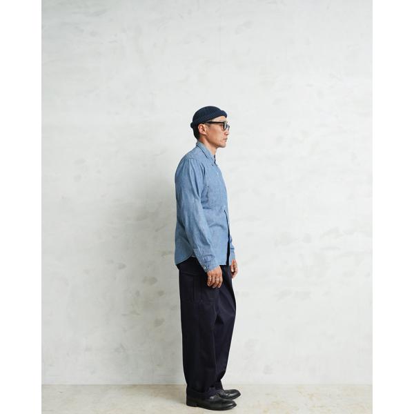 深みのあるネイビーブルーの色合いと、程よくテーパードされたシルエットが特徴で、ミリタリーアイテムでありながら、上品で洗練された印象を与えるため、カジュアルからフォーマルまで幅広いコーディネートに対応します。