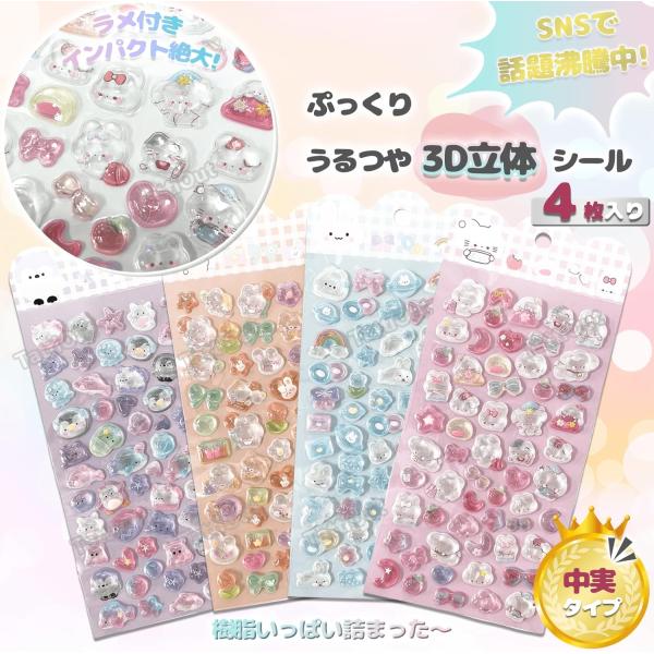シール ぷくぷく 4枚 中実 ぷっくり 立体 デコシール 3D ごほうび ステッカー 手帳デコ 猫 キラキラ 推し活デコ 女の子 子供 プレゼント