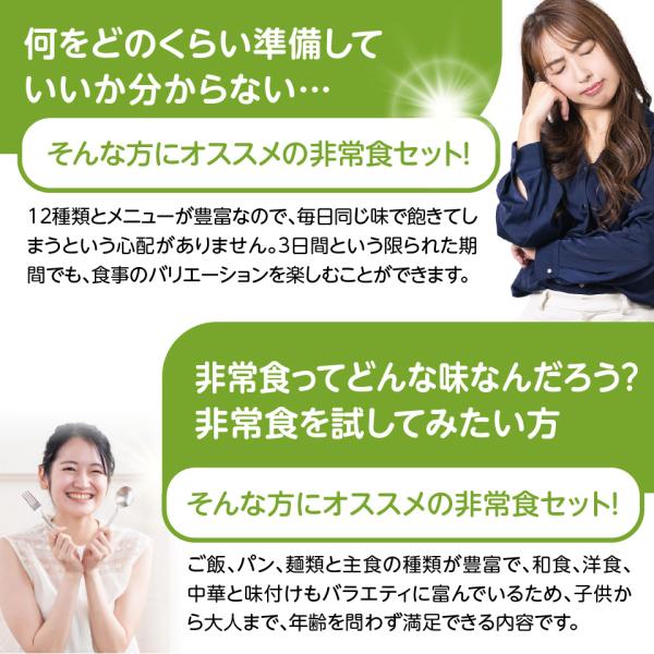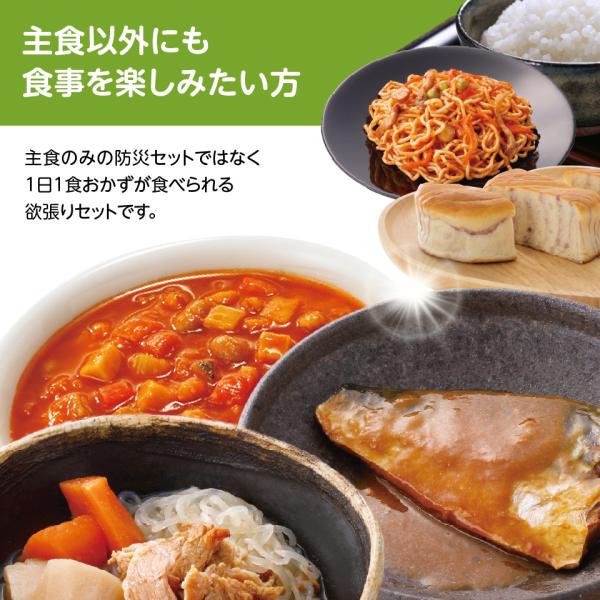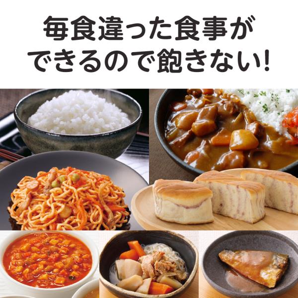 アルファ米 白飯×1、アルファ米 わかめごはん×1、アルファ米 五目ごはん×1、アルファ米 えびピラフ×1、CoCo壱番屋監修 尾西のカレーライスセット×1、ライスるん 単品 白米+ホタテ貝カルシウム×1、常温長期賞味期限食品 ロングライフフーズ やわらかナポリタンスパゲッティ)×1、カゴメ野菜たっぷりトマトのスープ ×1、The Next Dekade7年レトルトパン ブルーベリー×1、しっとりコッペパン×1、常温長期賞味期限食品 鯖味噌煮×1、常温長期賞味期限食品 肉じゃが×1
