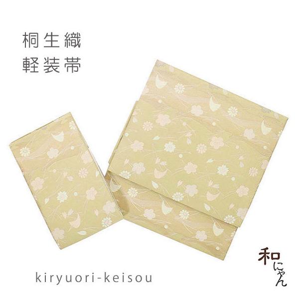桐生織軽装帯【花葉ちらし カラシ地】仕立上 簡単軽装帯 名古屋帯 作り帯 ワンタッチ帯 お太鼓 付け帯 付帯 文化帯 京袋帯 カジュアル 小紋 結び帯