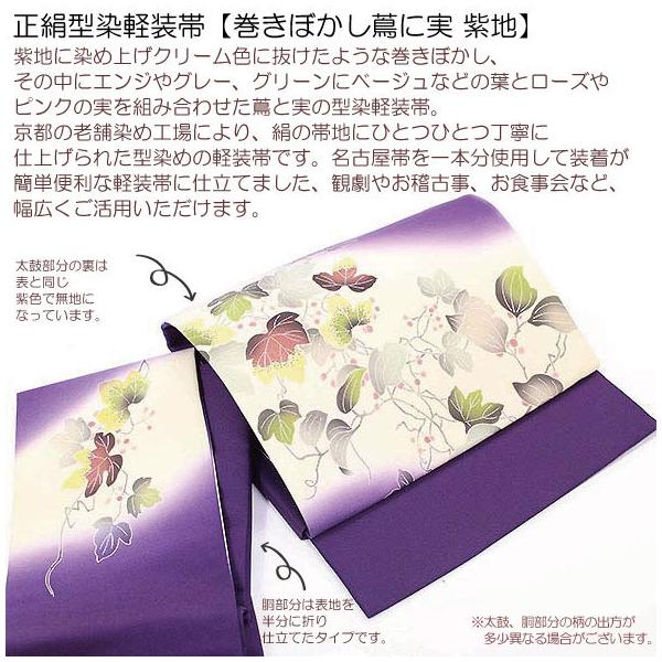 正絹型染軽装帯【巻ぼかし蔦に実・紫地】絹100% 仕立上 簡単軽装帯 作り帯 ワンタッチ帯 お太鼓 付け帯 二部式軽装帯 型染 染め帯 蔦柄