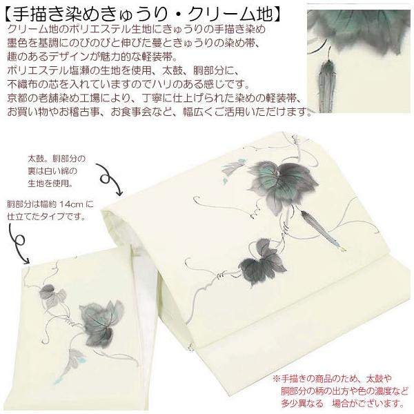 手描き染め軽装帯【手描き染め きゅうり クリーム地】ワンタッチ帯 染帯 簡単 軽装帯 手描き染 染め帯 作り帯 付け帯 付帯 二部式 文化帯 太鼓 お太鼓