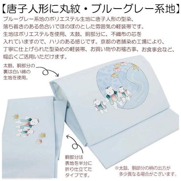 塩瀬染軽装帯【唐子人形に丸紋・ブルーグレー系地】ワンタッチ帯 染帯 簡単 軽装帯 型染 染め帯 作り帯 付け帯 付帯 二部式 文化帯 太鼓 お太鼓