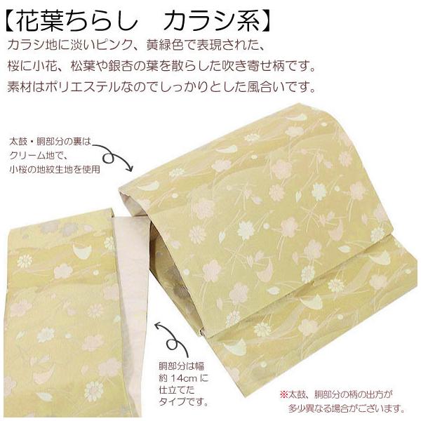 桐生織軽装帯【花葉ちらし カラシ地】仕立上 簡単軽装帯 名古屋帯 作り帯 ワンタッチ帯 お太鼓 付け帯 付帯 文化帯 京袋帯 カジュアル 小紋 結び帯