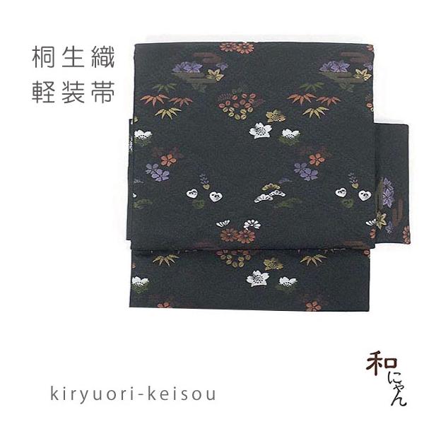 桐生織軽装帯 草花柄 黒地 花柄 簡単軽装帯 作り帯 ワンタッチ帯 お太鼓 付け帯 付帯 文化帯 京袋帯 カジュアル 小紋 結び帯 名古屋帯