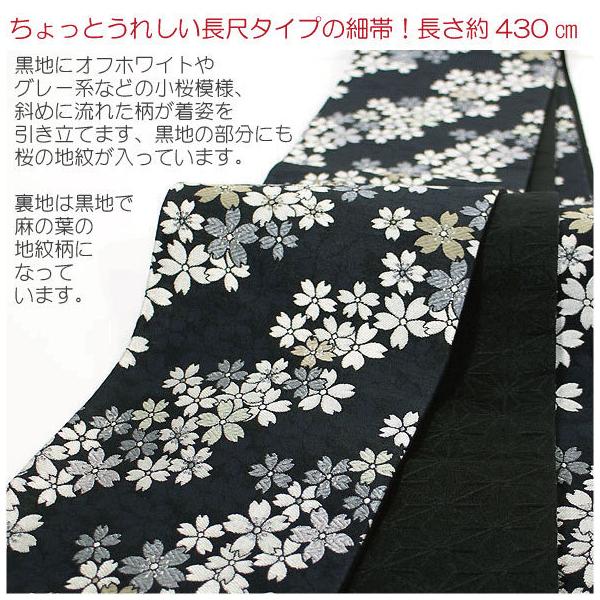 桐生織おしゃれ細帯【小桜タズナ・黒地・長尺】仕立上・半幅帯・半巾帯・細帯・小袋帯・桐生織・長尺タイプ・リバーシブル・小紋・両面・カジュアル帯・桜