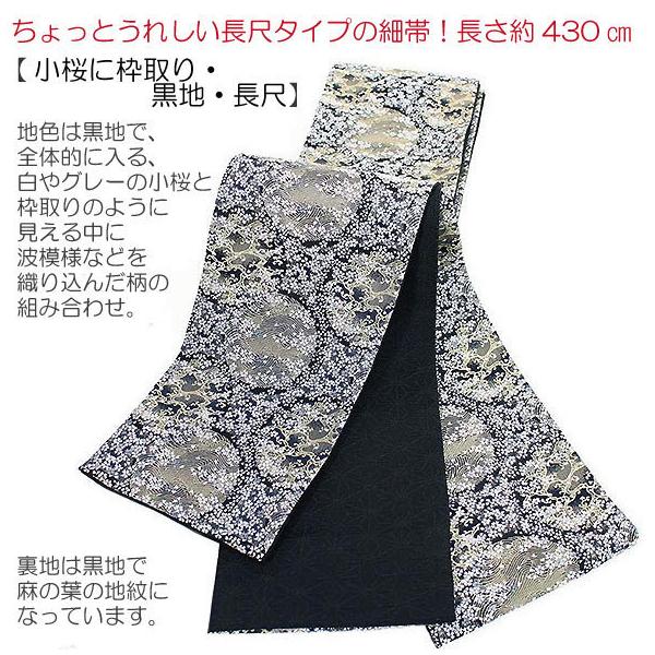 桐生織おしゃれ細帯【小桜に枠取り・黒地・長尺】仕立上・半幅帯・半巾帯・細帯・小袋帯・桐生織・長尺タイプ・リバーシブル・小紋・両面・カジュアル帯