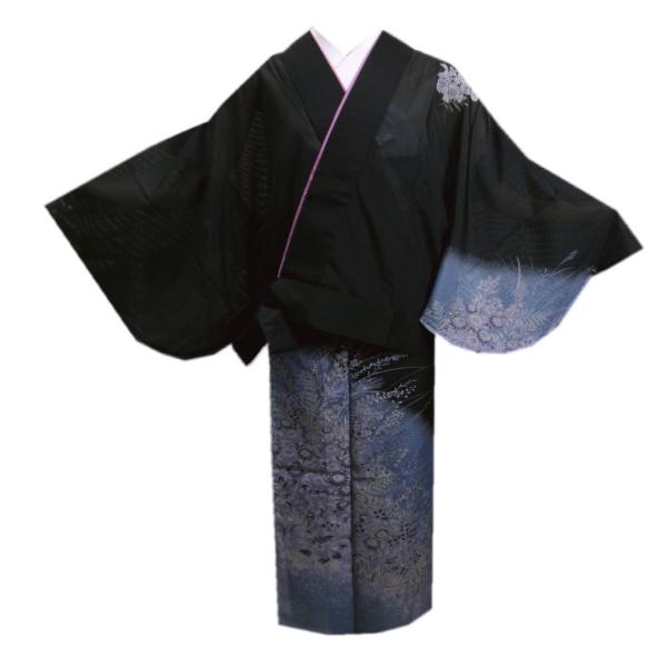 二部式 着物 絽 夏用 黒色地野菊草花青グレーたたきぼかし M L 日本製 絵羽柄 付下げ柄 洗える ユニフォーム 簡単 セパレート 女性用 夏物 きもの