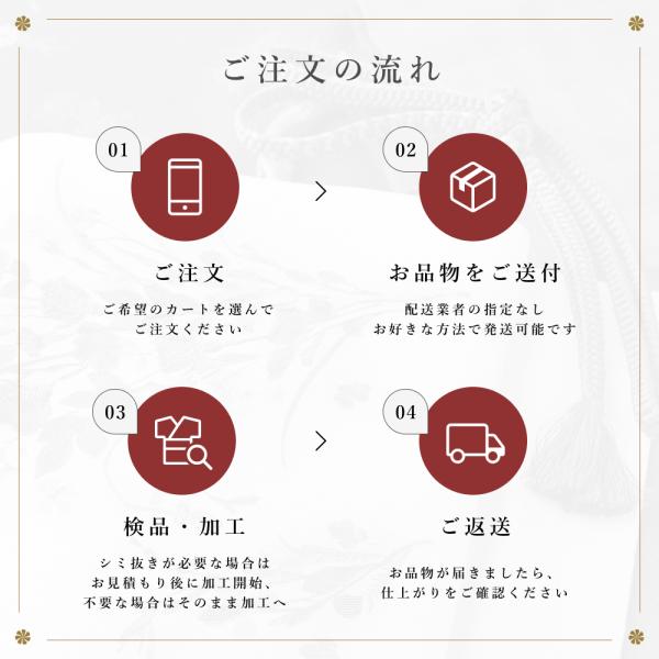 こちらにお着物が到着後、お見積もりをさせていただき、メールにてご連絡をさせていただきます。