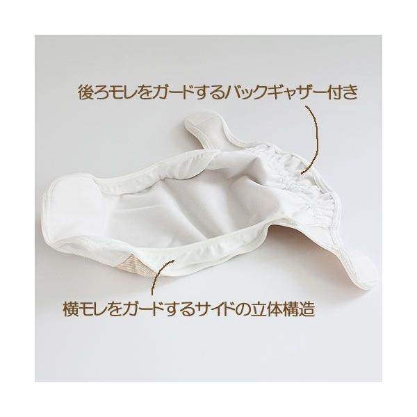 内側には防水布を使用し、横モレを防ぐ立体ギャザーと、後モレを防ぐバックギャザーがついた安心設計です。