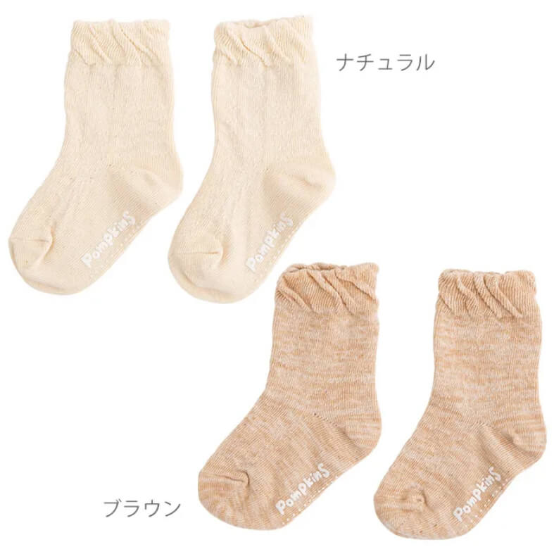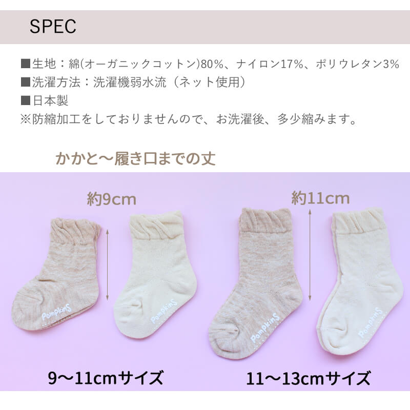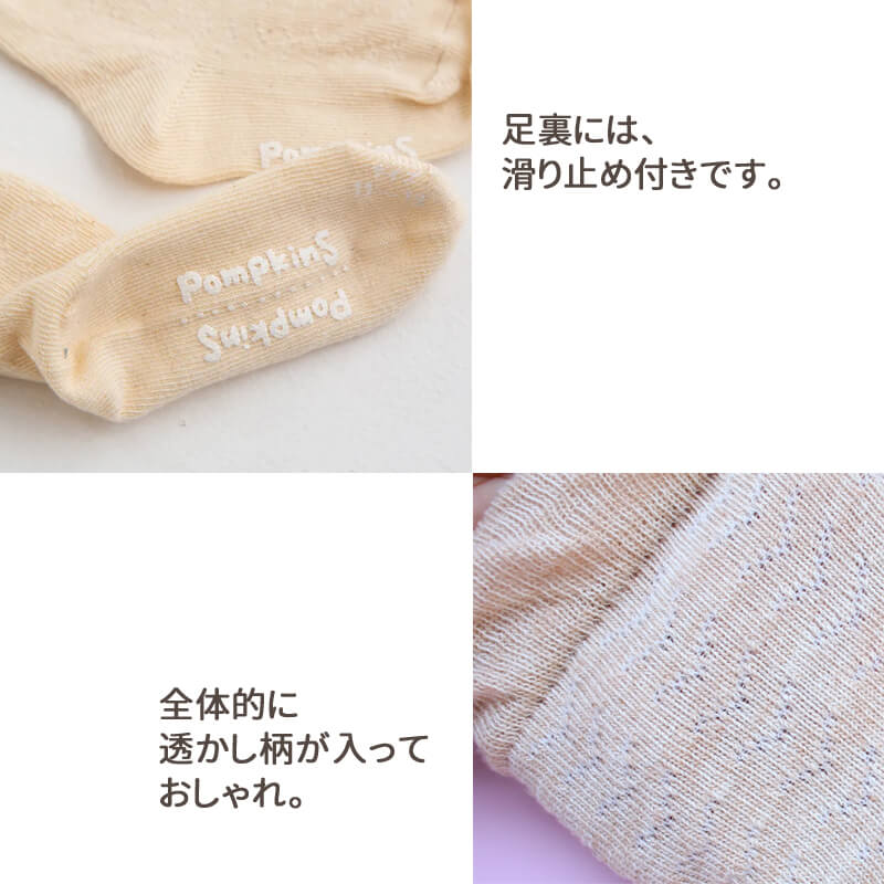 全体に透かし柄が入っています。足裏のpompkinsのロゴが滑り止めになっています。●サイズ:XS(9〜11cm)、SS(11〜13cm)●素材:オーガニックコットン(綿)80%、ナイロン17%、ポリウレタン3%●日本製●洗濯方法:洗濯機弱水流(ネット使用)※防縮加工をしておりませんので、お洗濯後、多少縮みます。