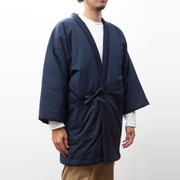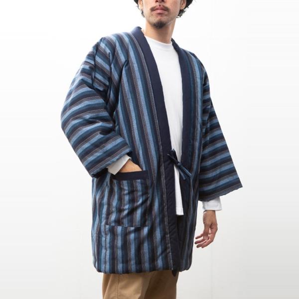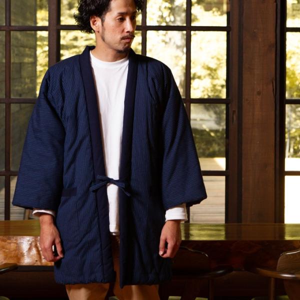 商品名:日本製 半纏 メンズ 久留米織 綿入れ 中綿 紬織 かつお縞 男性用 はんてん 中綿 おしゃれ 防寒 暖かい どてら 冬