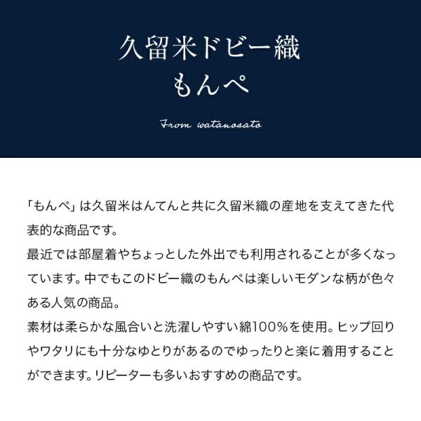 自社工場で織り上げた純国産品の久留米織、絣調ドビー織のもんぺです。