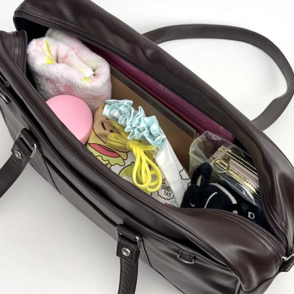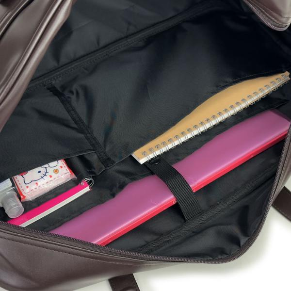 合成皮革を使用したシンプルなデザイン。パスケース等を取り付ける時に便利なDカン付き。底にはコーナーガードや底鋲がついており、擦れや汚れからバッグを守ります。メインルームは教科書やノート、A4ファイルなどもしっかり入るから、授業が多い日にもきちんと対応。底板付きでお弁当や教科書もたっぷり収納で安心♪フロントのファスナーポケットはケータイ、ペン、手帳など収納するのにベンリなポケットが付いています。持ち手が長めでゆったりと肩に掛けられます。通学用にはもちろん、部活、塾通い、お稽古事などいろいろなシーンで適用します。合格祝いや入学祝いのプレゼントにも最適!