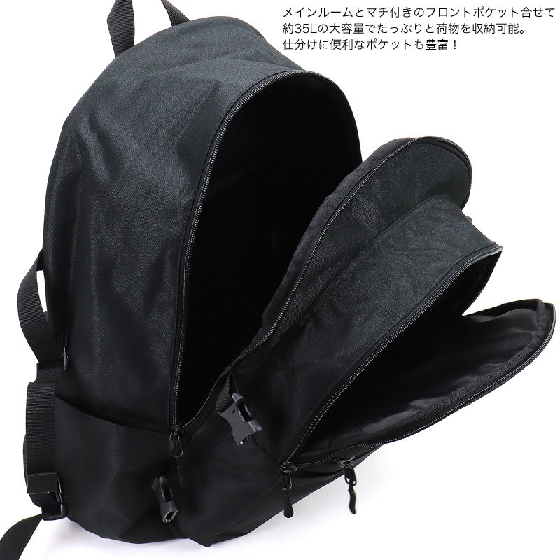 ・メインルームとマチ付きのフロントポケット合せて約35Lの大容量で荷物が多い人にもオススメのサイズ感。