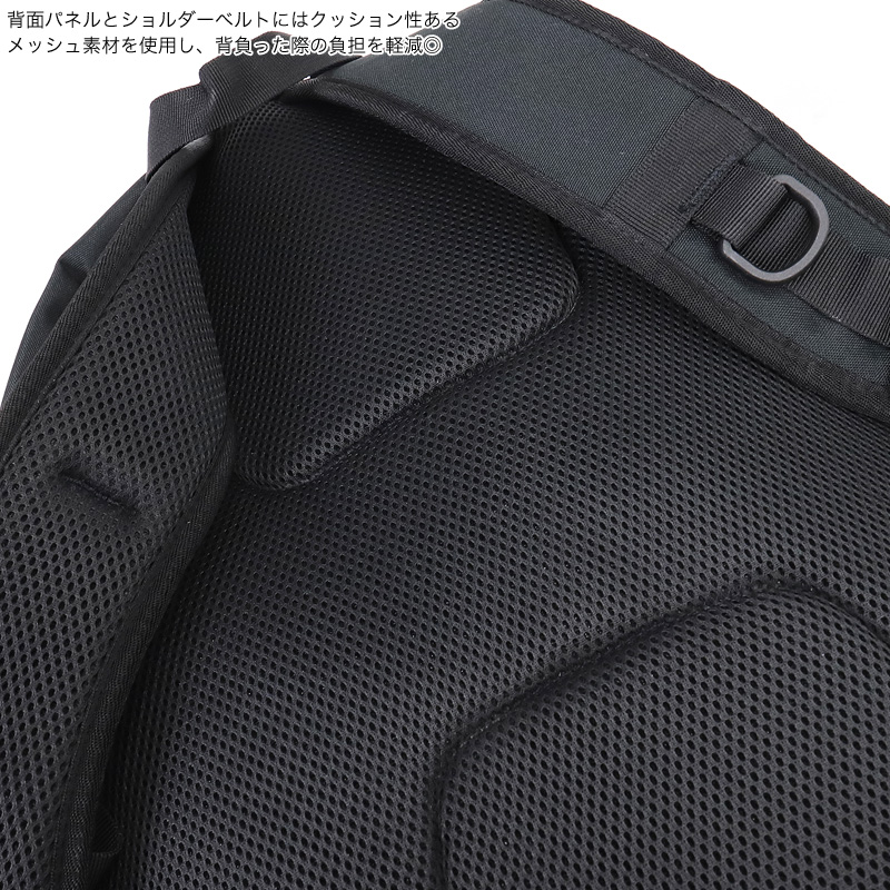 ・背面パネルとショルダーベルトにはクッション性あるメッシュ素材を使用し、背負った際の負担を軽減◎