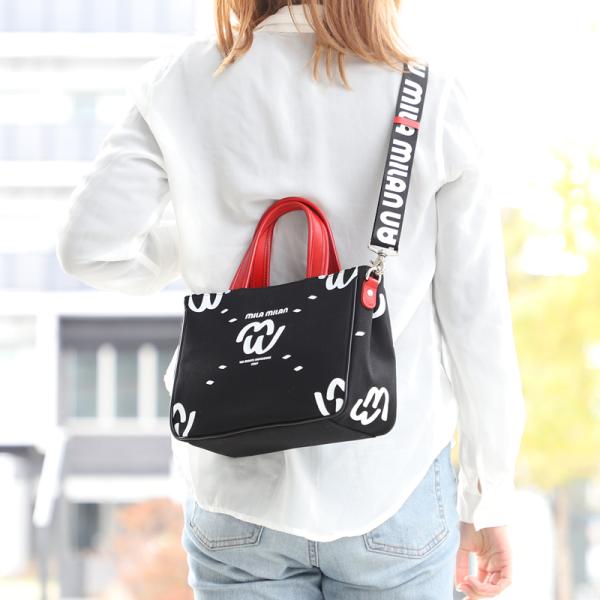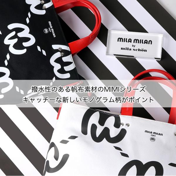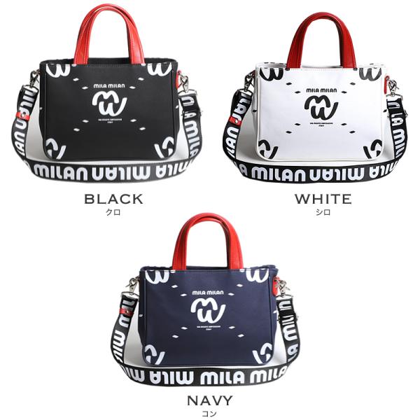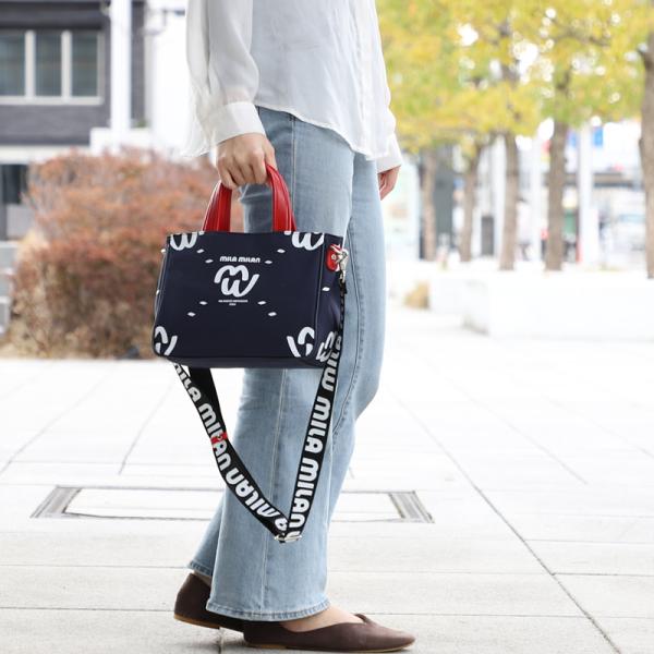 mila milanのブランドロゴがプリントされた肩紐が付属しており、ショルダーバッグとしても持つことができる2WAY仕様です。