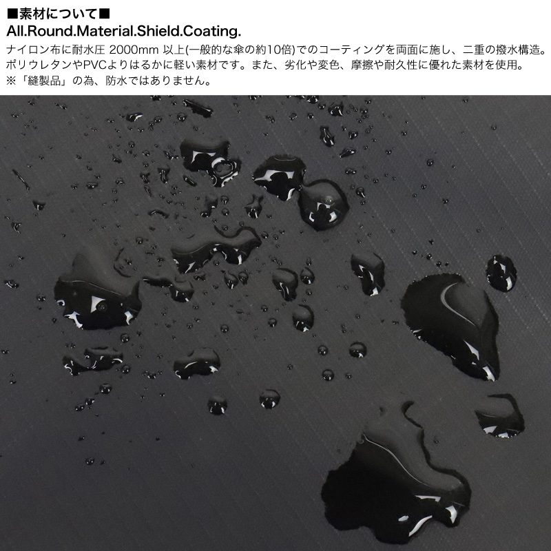 ・ナイロン布に耐水圧 2000mm 以上(一般的な傘の約10倍)でのコーティングを両面に施し、二重の撥水構造。軽量で劣化や変色、摩擦や耐久性に優れた素材を使用。※「縫製品」の為、防水ではありません。