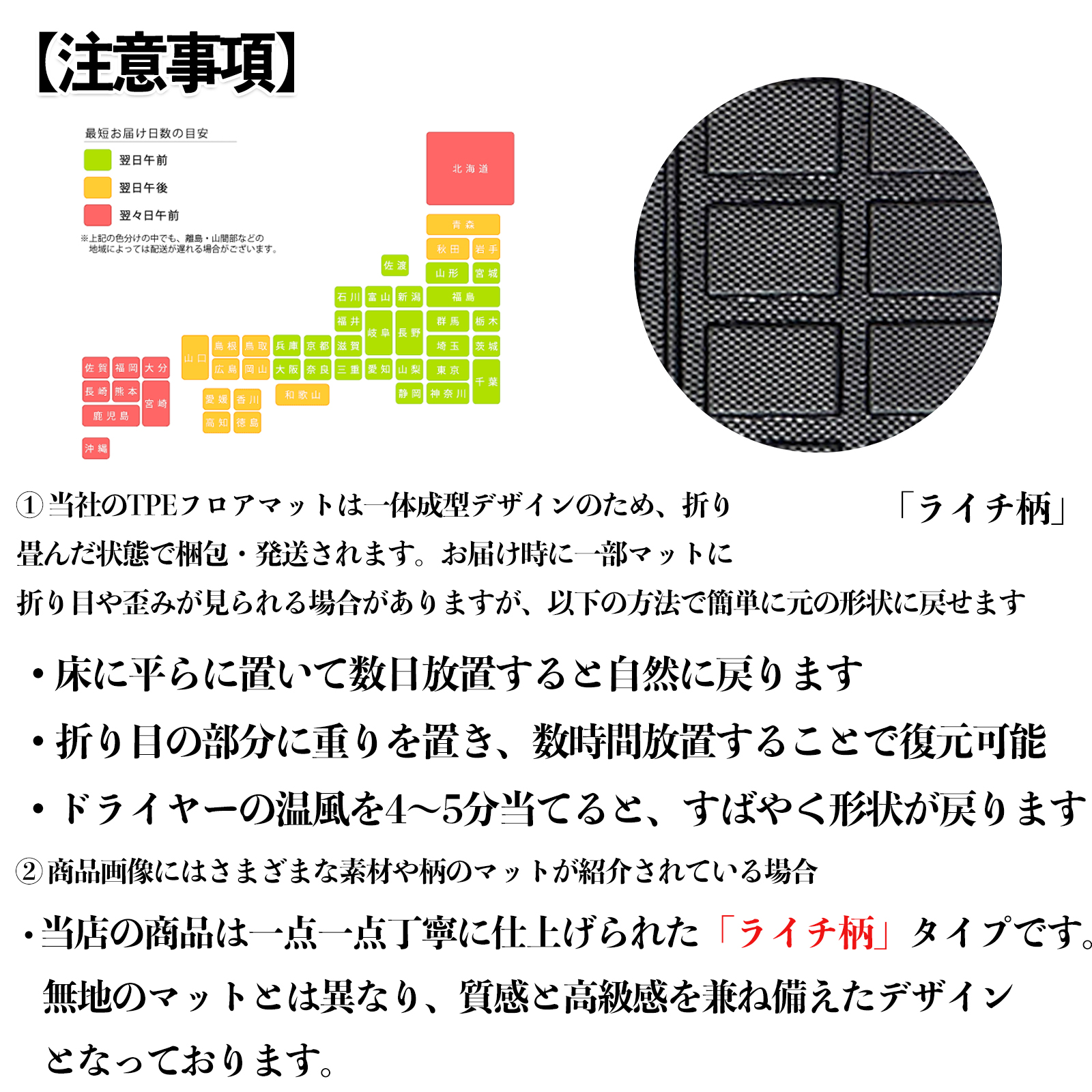 折りたたんで梱包しているため、届いた直後に折り目がある場合があります。平らに置く重しを乗せるドライヤーで温めるなどの方法で簡単に元に戻せます。