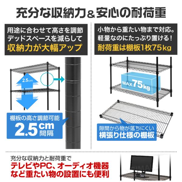 スチールラック メタルラック 幅90 4段 耐荷重300kg ぐらつき防止 90×30×120cm 高さ調節可能 錆びに強い ブラック 収納ラック シェルフ
