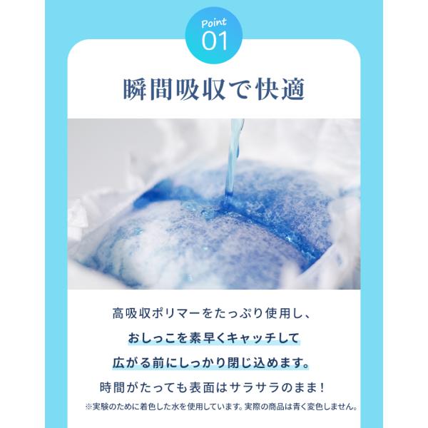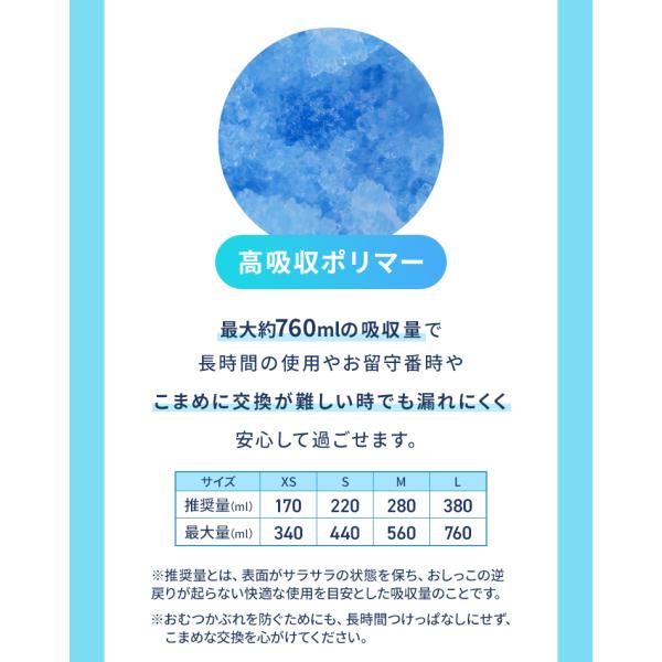 高吸収の紙おむつ素材を使用し、おしっこを素早く吸収してしっかりガード。動きやすさを考えた立体構造と、ズレにくいフィット感で、愛犬が長時間着けていても快適です。