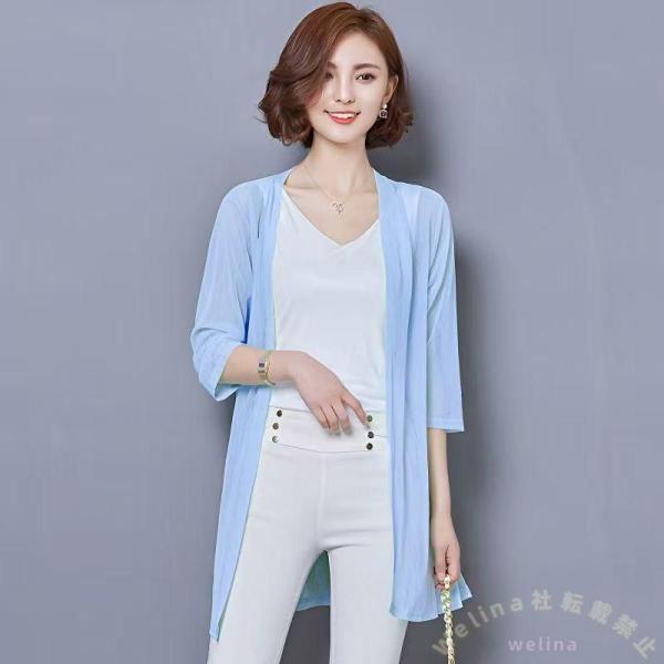 シアーカーディガン ロング丈 サマーニット ストレッチ Welina(株) 7分袖/五分袖 無地&杢調 シャリ感トッパー 冷房&日差し対策 春夏に