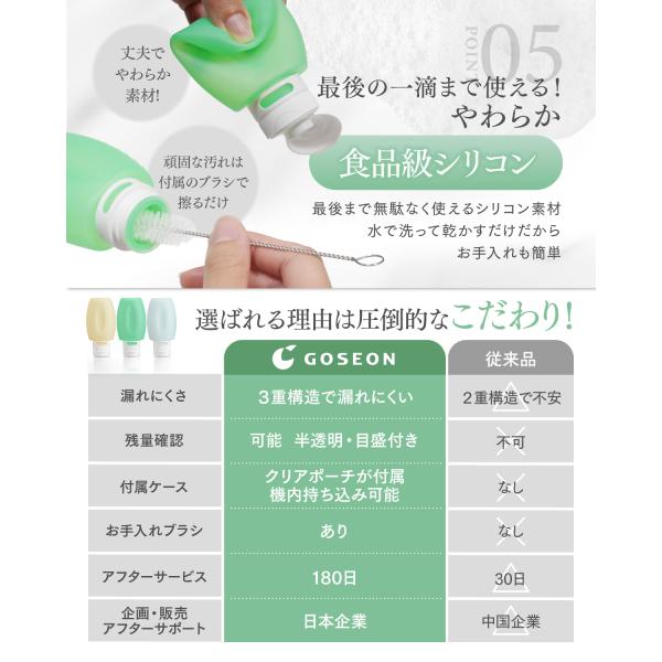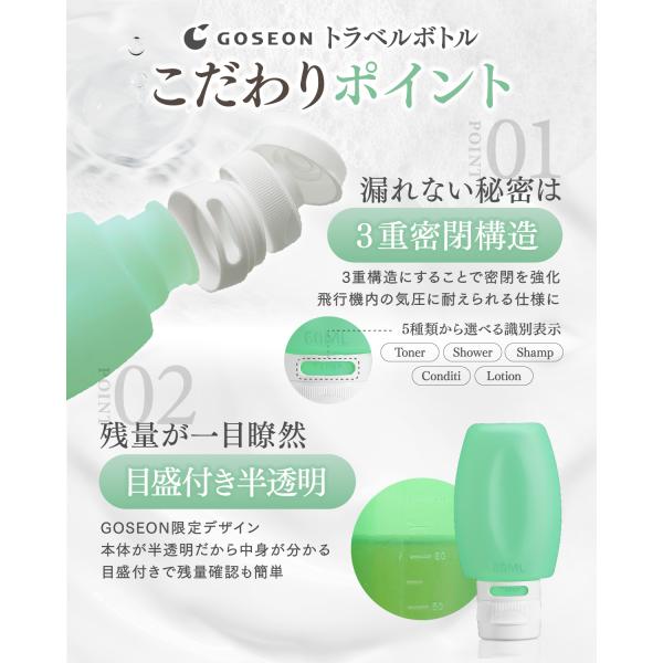 【液漏れを防ぐ特殊3重構造】旅行に必需品の液体ボトル。出張や旅先で液漏れを心配しないために開発したのがGOSEONの詰め替え用トラベルボトル。シリコンが蓋に隙間なく密着をし液漏れを防ぐ。さらに、フタを3重構造にすることで密閉を強化。飛行機内の気圧の変化にも耐えられる仕様に!