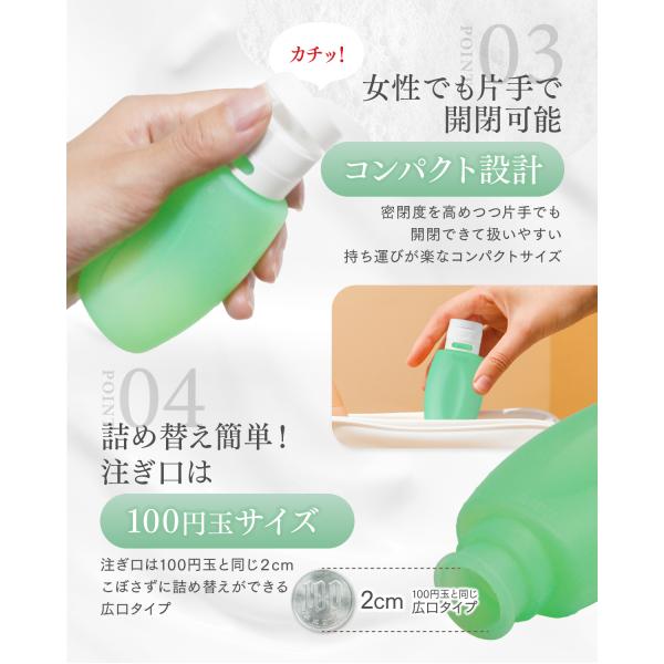 【使いやすさにこだわったトラベルボトル】注ぎ口は100円玉サイズと同じ2cmの広口タイプ。市販の液体ボトルは注ぎ口が狭いですが、GOSEONのシリコンボトルなら、シャンプーやコンディショナーをこぼさずに注ぐことができる!密閉度を高めつつ女性でも片手で簡単に開閉可能!