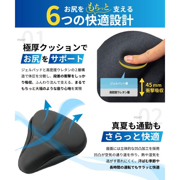 【痛くない超肉厚4.5cmクッションでもちっと衝撃吸収 長時間の走行でもお尻が痛くなりにくい、超極厚4.5cmクッション。クッションパッドと高密度ウレタンの2層構造で 体圧を分散し、段差の衝撃をしっかり吸収ふんわり沈んで、支える。まるで、もちっと大福のような座り心地を実現