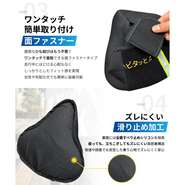 【ズレにくい滑り止め加工】裏面には全面すべり止めシリコンを採用。座っても、立ちこぎしてもズレにくい高密着構造。坂道や段差でも安定した乗り心地でズレにくく安心