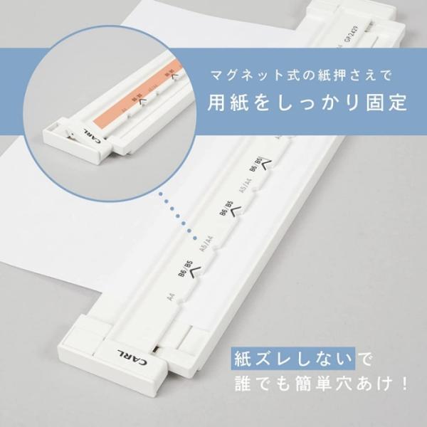 A4用紙に34穴、B5用紙に29穴、A5用紙に24穴、B6用紙に21穴を開けることができます。(ISO規格穴対応。1/3インチピッチ)