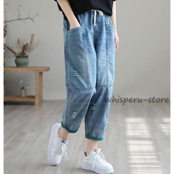 デニムパンツ レディース テーパードパンツ 夏 春 ワイド ボトムス ジーパン ウエストゴム 森ガール 無地 ズボン 柔らかい ゆったり 体型カバー 薄手 ダメージ オシャレ カジュアル ファッション