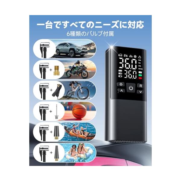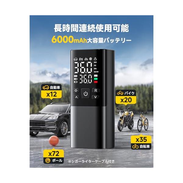 AAL 自転車 空気入れ 電動 電動空気入れ バイク 車 用 コードレス 6000mAh 大容量バッテリー 最大圧力150PSI 仏/英/米式バルブ