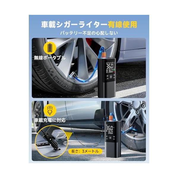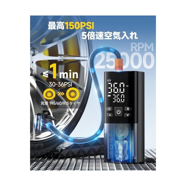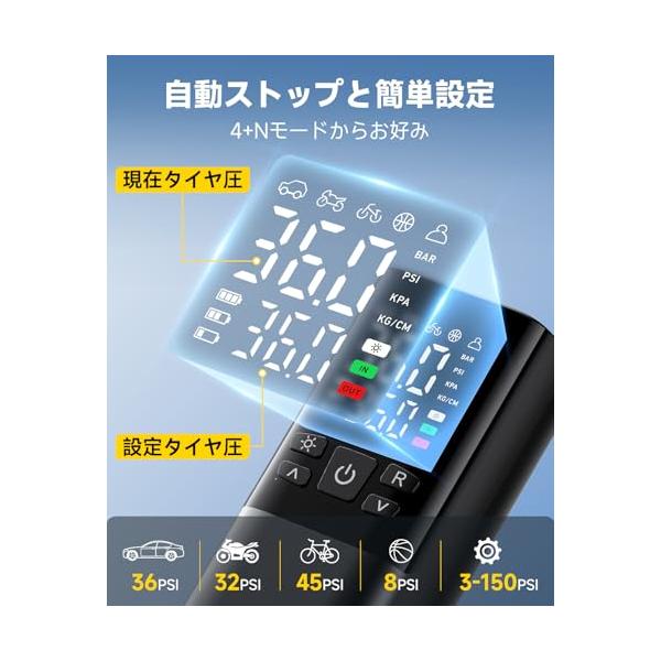 自転車 空気入れ 電動空気入れ バイク 車 仏/英/米式バルブ対応 最大圧力150PSI 高速充填 自動停止 6000mAh大容量電池 コードレス