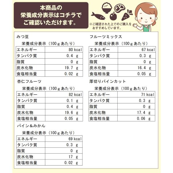 ■固形量:70g(フルーツミックス・厚切りパイン・パイン&みかん)80g(フルーツみつ豆・杏仁フルーツ)