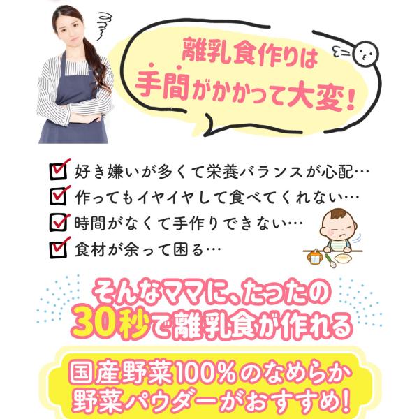 時間と手間がかかる離乳食づくりに悩んでいるママ・パパに、30秒で離乳食が作れる便利な野菜パウダーがおすすめ!