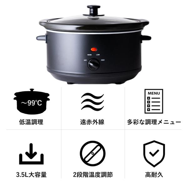 ・スロークッカーの仕組みを活用した焼き芋調理器。石焼き芋と同じ原理でねっとり美味しい焼き芋が簡単に出来上がります。