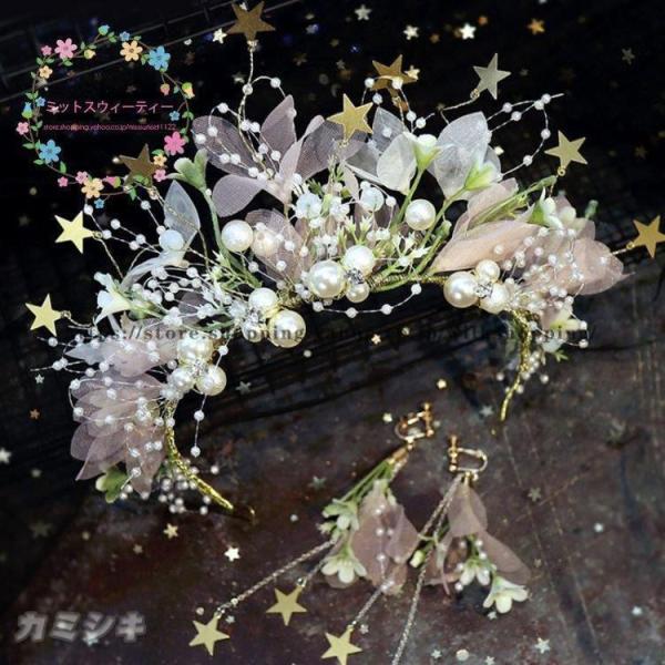 ティアラ 王冠 お姫様 髪飾り クラウン 花嫁 ヘアアクセサリー ウェディング 結婚式 パーティー 二次会 ウェディングフォト 夢 物語風 星 花 花冠+イヤリング