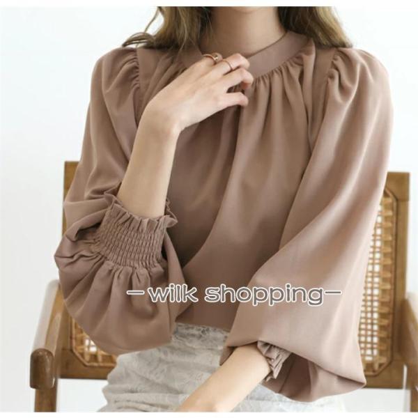 シフォンブラウス フォーマルシャツ 通勤 レディーストップス パフスリーブ 長袖 エレガント 無地 ギャザー ブラウス シャツ 卒業式 入学式 春夏 丸首 発表会