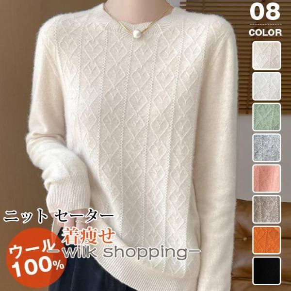 ニット セーター ウール100% レディース ニットセーター クルーネック 透かし編み ニットソー 長袖 無地 暖かい 防寒 保温