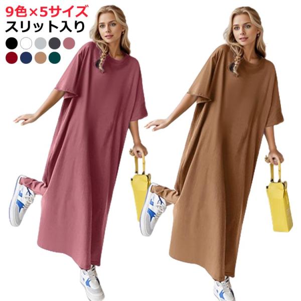 ワンピ ロング スリット ロングワンピ ワンピース ワンピース 半袖 Tシャツワンピ カットソー マキシワンピース レディース Tシャツワンピース ロ