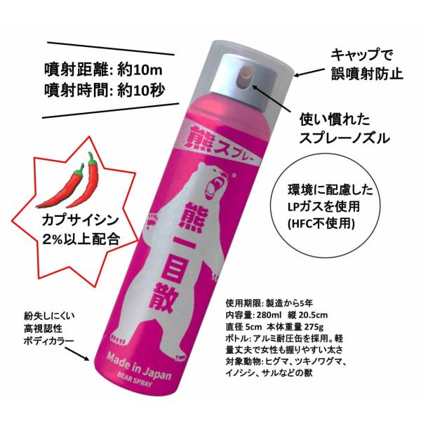 熊スプレー 熊一目散 Bear Spray日本初の純国産「熊撃退スプレー」が登場。安心と安全を、手の届く価格で身近に備える。■ボトルはアルミ耐圧缶を採用■軽量丈夫で女性も握りやすい太さ■カプサイシン2%以上配合