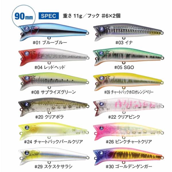 Gaboz!!!(ガボッツ)はポッパーのアクションとミノーのアクションを融合させたスイミングポッパーです。ボディ構造を徹底的に研究して、デッドスローからファストリトリーブまであらゆるスピードで決して潜ることなく、しっかりと水面で引き波を出しながら泳ぐことを実現しました。その日の状況や変化にしっかりと追従できる万能ポッパーであり、もちろん首振りポッピングも可能です。様々なシャローや根掛かりが避けられないカキ瀬の直上などで大活躍間違いなしです。
