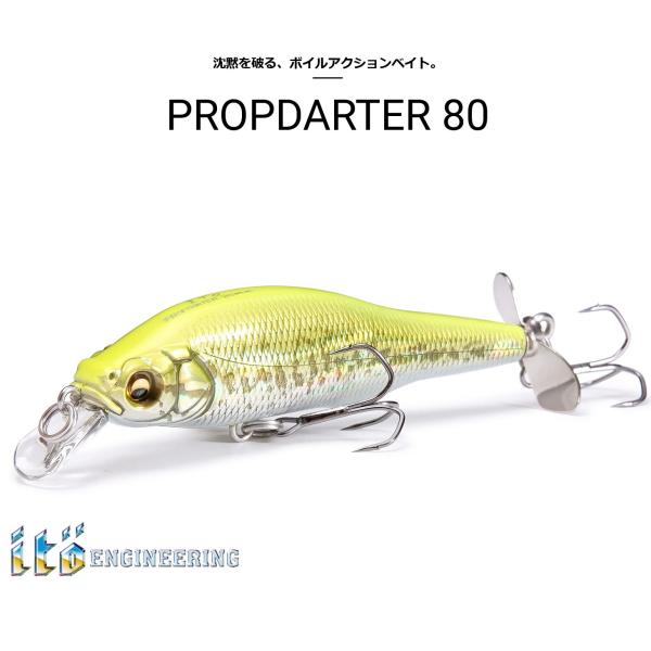 メガバス製X-80トリックダーターのモールドに、金属シムを噛まして容積をスープアップ。X-80より20%アップした浮力を身につけた上で、X-80のリップ形状をチューニング。トップウォータープラグとして水面を撹拌するためのリップ形状へとモディファイしています。なお、内部コアについては新規で設計し直しモールドを差し替え、X-80トリックダーターとはまったく別物の内部構造へとリファイン。だれでもロッドを立ててリトリーブすれば、絶妙なボイルアクションを生み出す、ファットボディへと変貌を遂げています。プロップダーターは、アイティオーエンジニアリングのチューニング技術を駆使して誕生した、新世代のボイルアクション系トップウォーターベイトです。