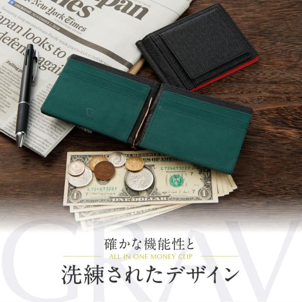 GRAV 財布 メンズ マネークリップ 二つ折り財布 小銭入れ付き 男性用 薄型 軽量 薄い レザー財布 小銭 メンズ カードケース ギフト