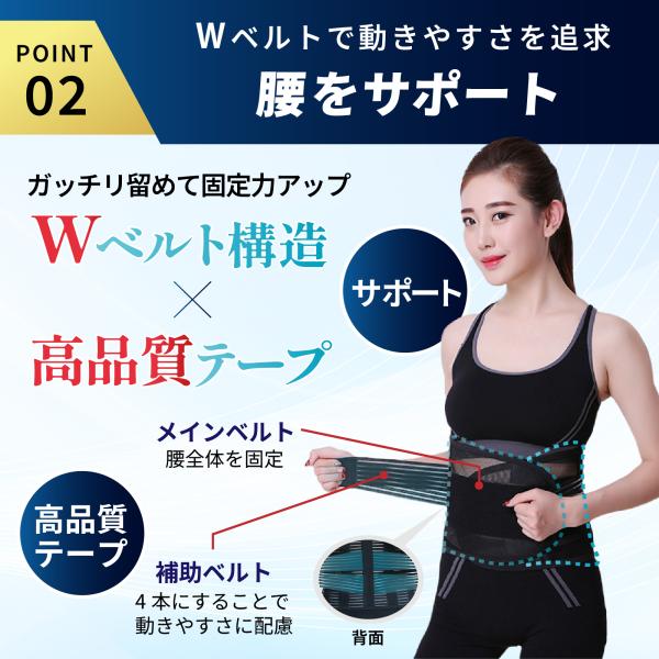 二重ベルトと6本の支柱で強力固定し仕事などで体を動かす場合でもズレにくくしっかりホールドします。