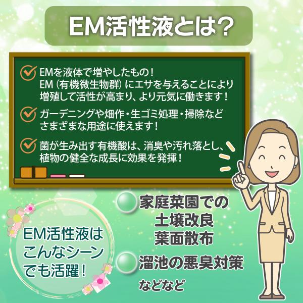 本製品の糖蜜とEM1(別売)を組み合わせる事で、家庭菜園の畑の土づくりや、ため池の悪臭低減に使えるEM活性液を作ることが出来ます。