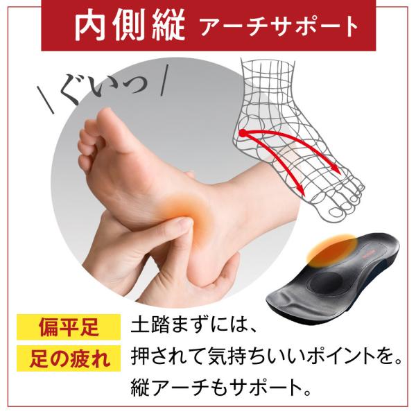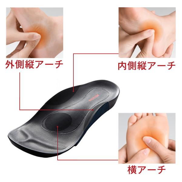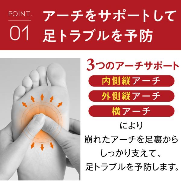 3つのアーチサポート(内側縦アーチ、外側縦アーチ、横アーチ)により、崩れたアーチを足裏からしっかり支えて、足トラブルを予防します。